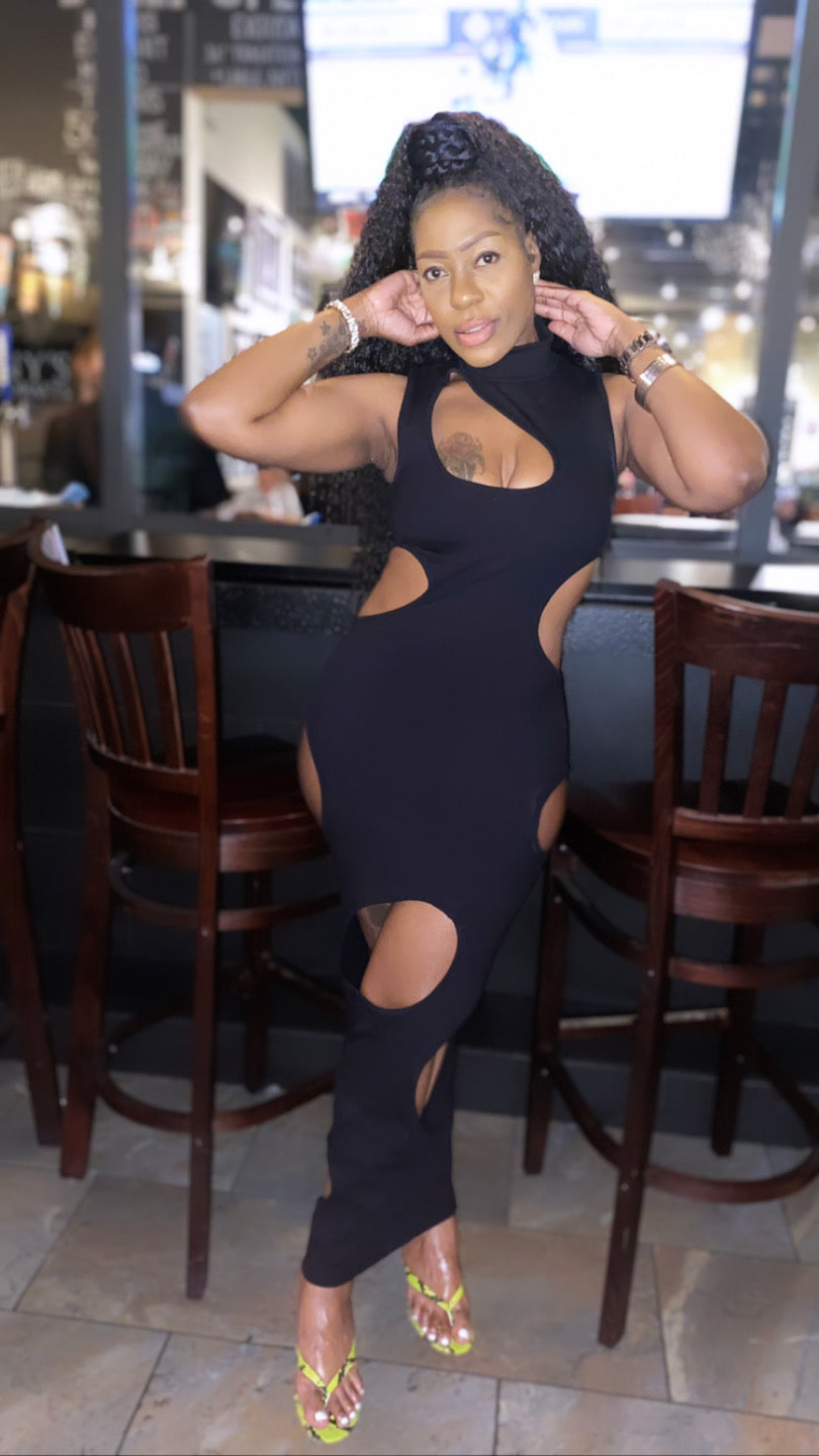 Black Long Maxi Dress with peak whole throughout. Great quality with great fitting stretch to give body shape.